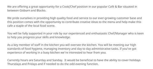 Are you an experienced chef or cook looking to reduce your working hours? then this might be the ideal job for you!