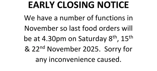 We have a number of functions in November so last food orders will be at 4.30pm on Saturday 8th, 15th& 22nd November 2025. Sorry for any inconvenience caused.